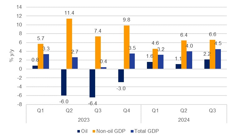 Abu Dhabi recorded real GDP growth of 4.5% y/y in Q3, up from 4.0% in Q2 and 3.2% in the first quarter. This marked the fastest pace of expansion in the emirate since Q4 2022 as OPEC+-mandated oil production curbs have held back growth in the oil economy over the past two years. Growth was driven primarily by the non-oil sector which grew 6.6% y/y and 5.9% ytd, in line with our full-year estimate of 6.0% growth last year.