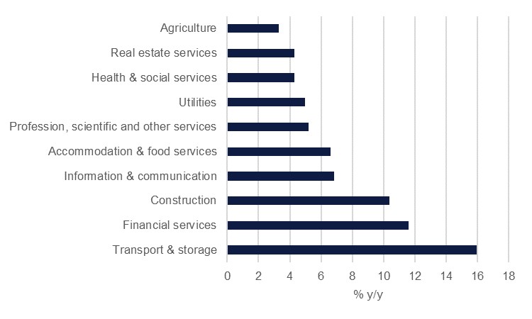 The fastest-growing sector in 2024 was the transport & storage sector, which was up 15.9% ytd and accelerated to 18.0% y/y in Q3. This is a similar story to Dubai where the sector has also been an outperformer. Strong growth in passenger numbers at Zayed International have been a key driver of this expansion, with January to September seeing 21.7mn people pass through the facility, up 31.2% y/y, while aircraft movements were up 10.2% y/y. Statistics Centre Abu Dhabi (SCAD)’s statement also highlighted the role played by the shipping and ports sector, with growth in container and general cargo throughput at the emirate’s port facilities.