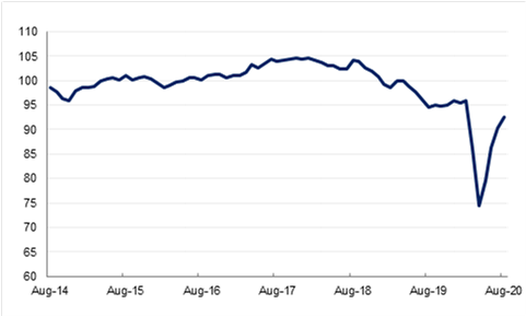 German Q2 GDP was revised slightly higher to -9.7% q/q (-11.3% y/y) from -10.1% q/q (-11.7% y/y) in the second reading. However, this is still a record contraction for the German economy. Household consumption, exports and investment in machinery and equipment all declined sharply in Q2 but government consumption rose slightly, likely reflecting coronavirus related spending. The IFO business climate index came in slightly better than forecast at 92.6 for August, up from 90.4 in July. Both the current situation and expectations components improved from July, but the overall index remains below pre-pandemic levels and the rate of recovery has slowed. Separately, the German government decided yesterday to extend the job-subsidy program to end-2021 to prevent companies from rushing to make employees redundant. 5.6mn people received the benefit in July, according to Bloomberg.