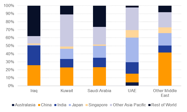 Oil importers historically haven’t had an ability to hedge risks encountered along the Middle East’s bumpy path to diversification but by pooling purchases China’s oil companies may be able to exert pressure on exporters for more favourable terms. China may be reliant on importing crude from the Middle East but the region is just as dependent on China as a baseload consumer of its exports. Iraq is highly exposed to China with more than 25% of its total exports landing there while Saudi Arabia and Kuwait see around 23% of their shipments end up in China.