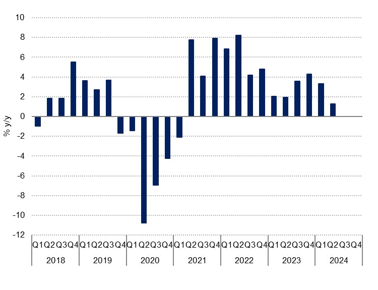 Bahrain logged real GDP growth of 1.3% y/y in the second quarter, marking a slowdown from the 3.3% registered in Q1. That means that H1 saw y/y growth of 2.3%. On a quarterly basis, Q2 expanded 2.2%, compared with a 4.0% q/q contraction in the first quarter. We are holding to our annual growth forecasts of 2.4% this year, and 3.3% in 2025, which would make Bahrain's the second-strongest growth in the GCC in 2024, after the UAE. This reflects the smaller proportion of the oil economy compared with most of the region (less than a fifth of Bahrain’s output over the past decade). As more oil production is expected to come back online in the GCC next year, both the UAE and Saudi Arabia will outpace Bahrain according to our forecasts, but Bahrain should also benefit from a pick-up in hydrocarbons activity.