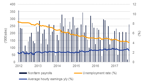 The US added 261k jobs in October and September’s payroll figures were revised from a decline of 18k jobs to growth of 33k. A large jobs number was expect as regions of the US affected by hurricanes in September recovered but the revision to prior data shows the impact was less severed than had initially been estimated. The unemployment rate also moved lower and has settled at a 17-year low of 4.1%. However, a decline in the labour force was a catalyst in helping the unemployment rate extend its decline. Average hourly earnings moved lower, growing by 2.4% in October from 2.8% a month earlier. The backward movement in wages does raise questions over how tight the labour market in the US really is.