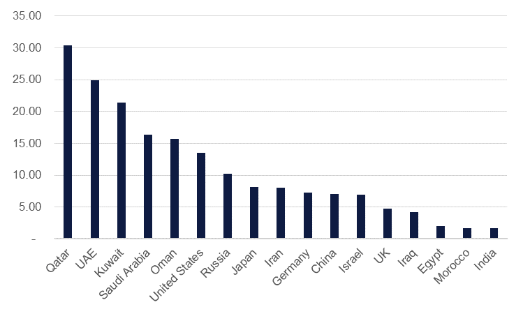 There is a compelling need for economies in the Middle East, and in particular the GCC, to lower their carbon emissions. Compared against peer economies, carbon emissions on a per capita basis are substantially higher. The UAE’s carbon emissions per capita was nearly 25 metric tonnes CO2 in 2020 compared with around 14 metric tonnes in the US or 7 metric tonnes in Germany.