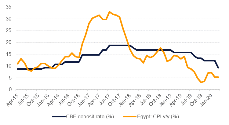 The Central Bank of Egypt (CBE) kept its benchmark overnight deposit and lending rates on hold on Thursday, at 9.25% and 10.25% respectively, in line with expectations. While the multigenerational upheaval caused by the coronavirus pandemic currently seen around the world, and in Egypt, makes it more difficult to predict where rates may end up this year, our expectation would be that the bank will keep them steady for the next several meetings.
