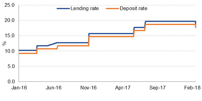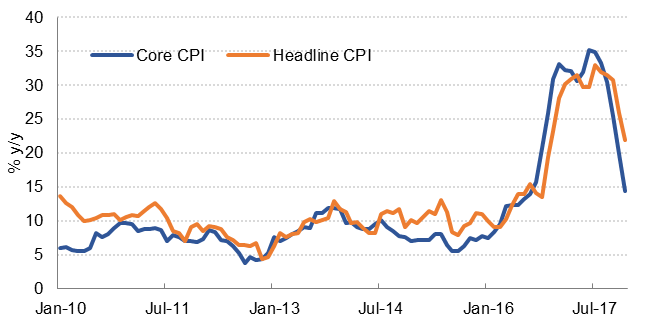Easing monetary policy would support the ongoing real GDP growth recovery in Egypt, which registered at 5.3% y/y in Q2 FY2017/18, marking the fifth consecutive quarter of stronger growth. Real GDP growth in calendar 2017 was 5.0%, the strongest since 2010, just prior to the ouster of long-serving President Hosni Mubarak. Unemployment, at 11.3% in December, is also at the lowest levels since 2010. According to the MPC’s communiqué, this growth recovery has up to now been driven by greater external demand, owing to the more competitive currency, and public domestic demand, while private domestic demand has lagged. As monetary policy eases and inflation falls, we would expect this to pick up also.
