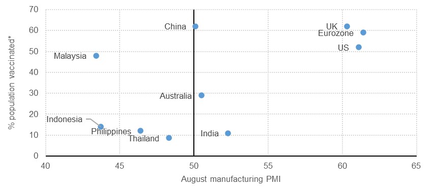 This is a trend we are likely to see weigh on Q3 growth figures from other Asian economies that have been seeking to completely contain the pandemic, with Indonesia, Malaysia, Philippines and Thailand’s PMIs all slipping well below the neutral 50.0 level in August as they contended with their own Covid outbreaks. And it is worth noting that it is not only developing nations that have been pursuing this strategy – Australia has had an especially stringent lockdown in place over the course of 2021, which will have weighed on private consumption there, while the New Zealand central bank’s plans to hike interest rates in August were derailed by the discovery of one positive Covid-19 result. Direct coronavirus pressures do seem to be easing globally, but the IMF has highlighted the persistent danger of new variants taking hold in countries with lower levels of vaccinations, and the deleterious effect that could have on future global growth.
