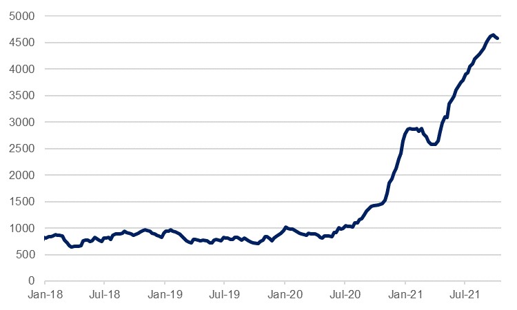For starters, some of that strong growth in exports is attributed to rising prices rather than higher output, meaning that inflationary pressures will continue to pass through to producers and consumers in developed market economies to varying degrees. Further, the effect of this surge in exports will continue to exert pressure on overladen supply chains; the Shanghai Conainerised Freight Index has dipped modestly over the past two weeks but remains over four and a half times higher than it was in pre-pandemic January 2020 as demand for shipping services far outstrips supply. These higher shipping prices and general disruption have been noted in respondents to PMI surveys in the Middle East, US and Europe as holding back their output for months now and are unlikely to alleviate to any marked degree before year-end given the amplifying bullwhip effect.