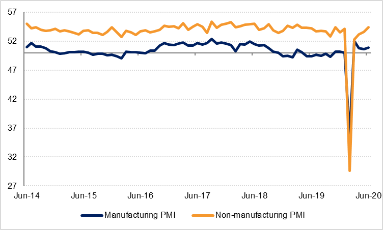China’s official manufacturing PMI rose slightly to 50.9 in June while the non-manufacturing PMI rose to 54.4 from 53.6 in May; both readings were better than the consensus forecast. The composite PMI increased to 54.2 this month, the highest reading since May 2018. Chinese exports benefitted from the gradual re-opening of economies around the world, but employment declined further. Separately, China approved the new security law for Hong Kong shortly after the US suspended regulations allowing the special treatment of Hong Kong, making it harder for US companies to export sensitive technology to the city-state.