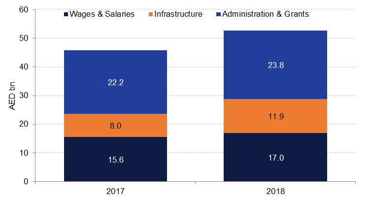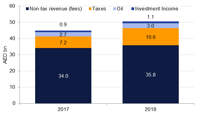 Total budget revenue is forecast at AED 50.4bn in 2018, up from AED 44.8bn in the 2017 budget. The main source of revenue remains non-tax revenues (fees), and this component is expected to grow 5% from 2017 to reach AED 35.8bn. Tax revenue is forecast at AED 10.6bn (up more than 47% y/y). While it has not been made explicit in the budget statement, we expect the higher tax income estimate is due to the introduction of VAT from the start of next year, and expected proceeds from this. Oil revenue is estimated to reach AED 3.0bn (12.5% y/y). Government investment income is also expected to rise in 2018 but remains a small contributor to overall budget revenue at just AED 1.1bn.