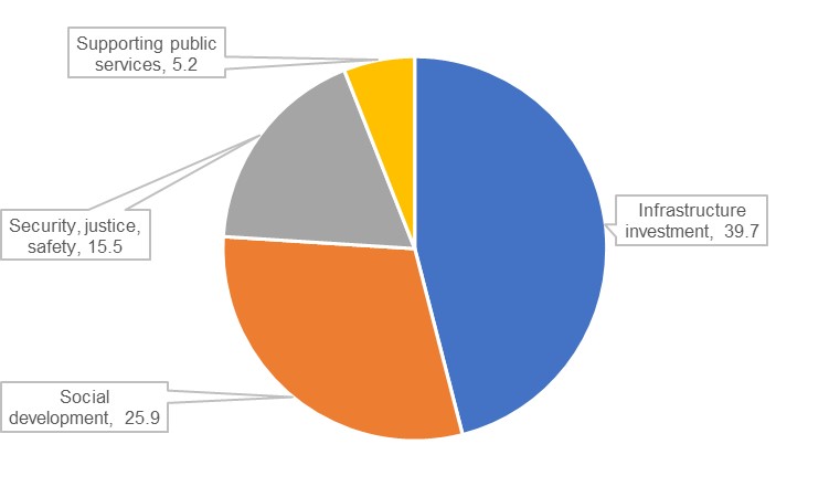 Of the remainder of the budgeted spending, 30% will go on social development (which encompasses health, education, and scientific research), 18% on the security, justice, and safety sector, and the remaining 6% on supporting the public services sector. This will include advancements made in the digitalisation strategy which should both streamline experiences for government services customers while also reducing current spending costs for the government over the long term.