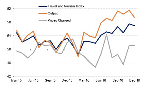 The travel & tourism sector index eased from the November high, to 56.7 in December. Output and new orders showed very strong growth again last month, but the expansion in output was at a slower rate than in November. Employment was largely unchanged in December in line with the trend we’ve seen throughout last year.