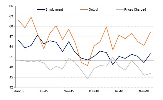 Consistent with what we’ve seen in the data through 2016, the rise in output and new work in December was partly driven by price discounting – the prices charged index fell to 47.7 last month from 49.4 in November, even as input costs rose. Employment was also broadly unchanged from November.
