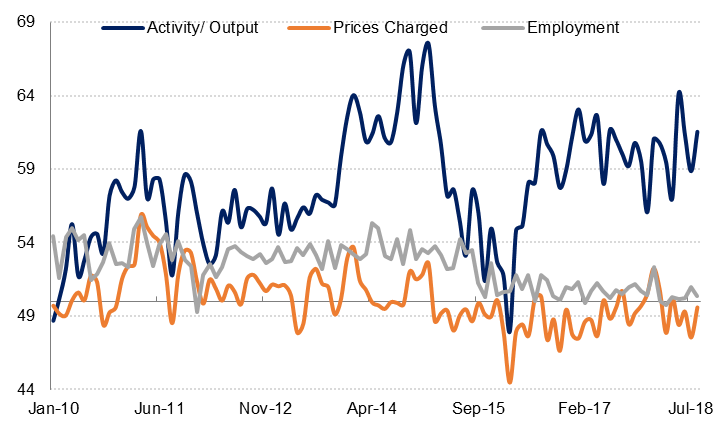 The average DET year to date is 55.6, only slightly lower than the same period last year (56.5). This suggests to us that Dubai’s economy is probably growing a similar rate to 2017, or a touch slower. Preliminary estimates from the Dubai Statistics Centre put last year’s GDP growth at 2.8%; about half a percentage point slower than our forecast for 2018. While this may seems a little optimistic right now, we do expect a modest acceleration in growth in the final quarter of this year.