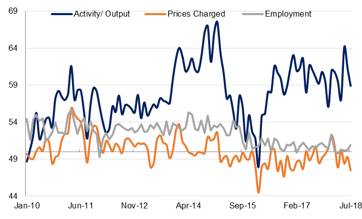 Against this background, it is unsurprising that employment growth so far this year has been the softest on record. Although the employment index ticked up to 50.9 in July, the average year to date is just 50.5, the lowest since the series began in January 2010.