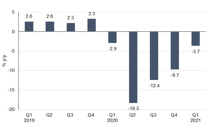Data for Q1 2021 shows Dubai’s economy grew 11% q/q but declined on an annual basis by -3.7% y/y. Once again, lower output in transport & storage and hotels & restaurants in the first quarter of this year (relative to Q1 2020) weighed on headline GDP growth. However, the largest sector of the economy, wholesale & retail trade, grew 2.8% y/y in Q1 21, while financial services (the second largest sector) grew 3.5% y/y. The manufacturing sector grew 3.2% y/y in Q1 21, and real estate services expanded 2.4% y/y even as construction output contracted on an annual basis.