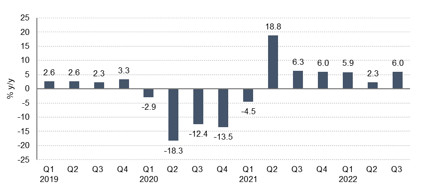Dubai’s economy grew 4.6% y/y in the first nine months of 2022, putting it on track to achieve our 5% full year GDP growth forecast. Growth slowed to 2.3% y/y in Q2 but then picked up again to 6.0% y/y in Q3.