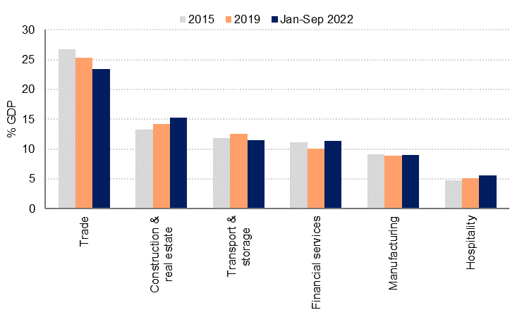 Looking at the sector breakdown of GDP over the last seven years, it is clear that wholesale & retail trade remains the largest single sector in Dubai’s economy, accounting for around 25% of GDP. However, the sector share of GDP has declined slightly since 2015, while the relative importance of construction & real estate services and restaurants & hotels has increased. Manufacturing, financial services, and transport & storage still account for 10-11% of Dubai’s GDP respectively, broadly unchanged since 2015.