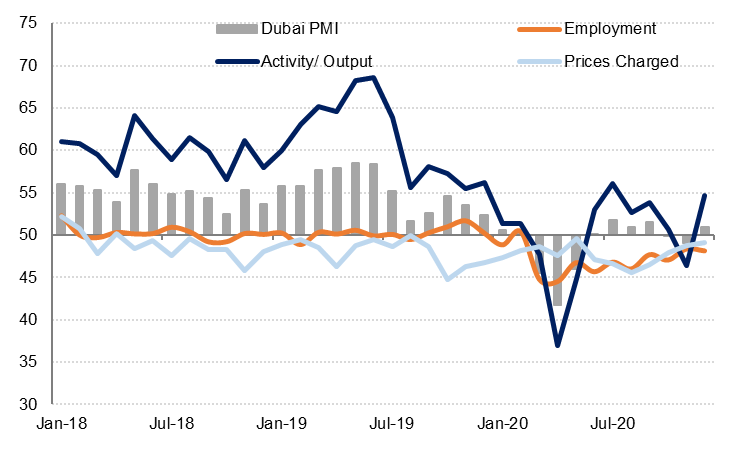 The Dubai PMI rose to 51.0 in December, indicating a modest expansion in the non-oil private sector for the first time in three months. Business activity and new work increased in December, with the rise in activity being the strongest since July. However, employment in the private sector continued to decline in December. Input costs were broadly unchanged from November, and selling prices declined only slightly. All the sector surveys showed an improvement from November.