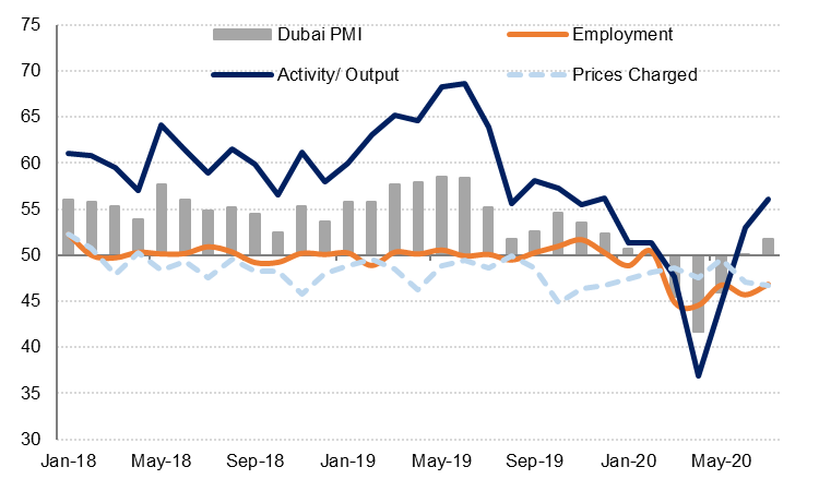 The Dubai PMI survey data signals a slow but steady recovery in economic activity over the last two months, as restrictions on movement and business activity have been progressively eased. However, the recovery in activity has not been sufficient to prevent firms continuing to lay-off workers as they seek to reduce costs, as cash flows remain weaker than usual. Output likely remains below pre-coronavirus levels, as the modest improvements in June and July were probably insufficient to offset the contraction in March through May.