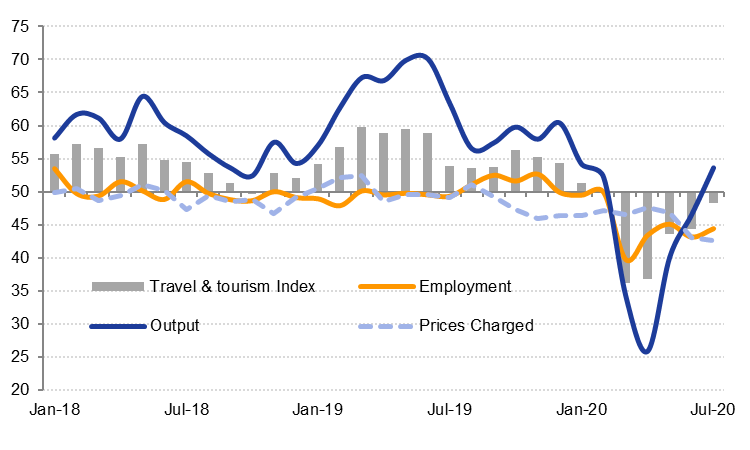 The sector surveys showed business conditions in the wholesale & retail trade and construction sectors improving again in July. The travel and tourism sector remained in contraction territory last month but business activity rose for the first time since February.