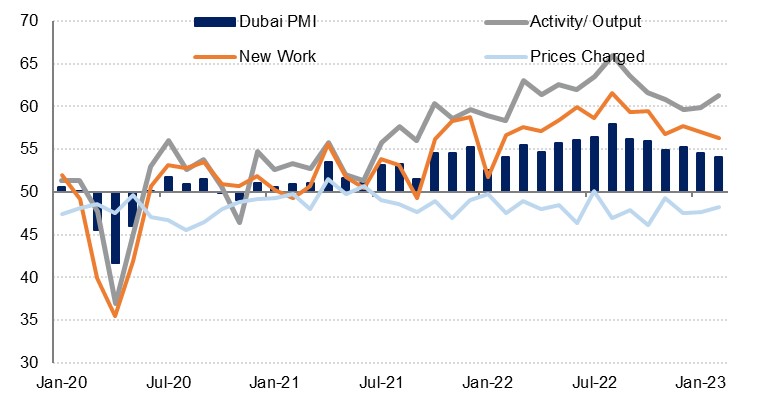 Wholesale & retail was the only sector to see a slowdown in February as it fell to 54.2, from 54.7, thereby weighing on the headline Dubai index. Firms continued to cut prices sharply to encourage business, with prices charged falling by the greatest degree since October. Nevertheless, new orders slowed to an eight-month low. Input costs rose for the first time in three months, albeit marginally, while there was a slight improvement in business sentiment.