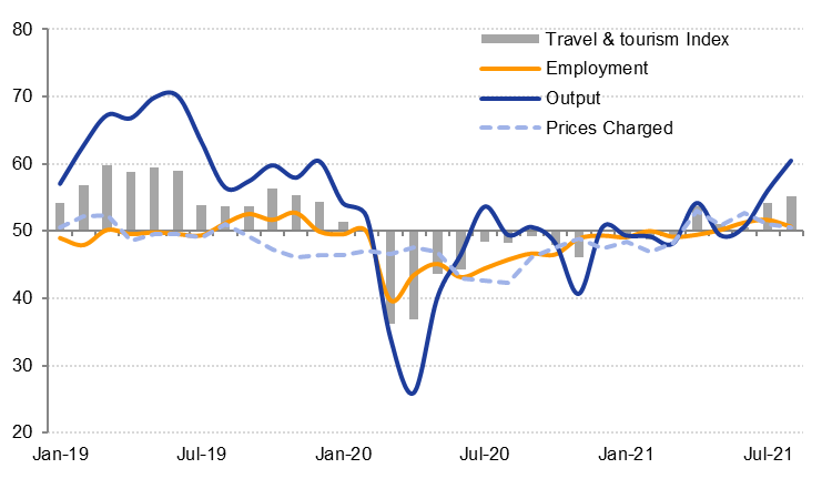 The travel and tourism index was the best performing of the three sector indices in August, rising to a 21-month high of 55.1 on the back of a sharp increase in business activity and faster growth in new work. Firms in the sector attributed the improvement to looser travel restrictions allowing more tourists; official visitor numbers have not yet been released for July and August. Despite the surge in activity last month, employment growth in the sector was the softest in three months.