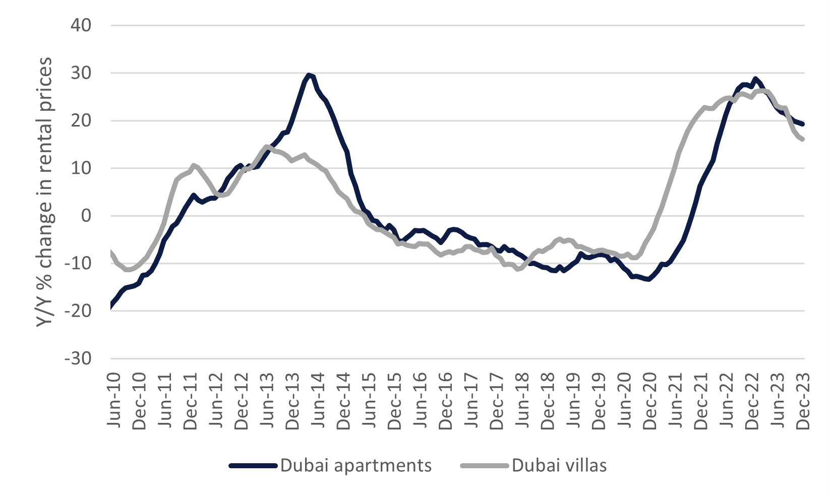Residential rents continued to grow but a slower pace. Dubai apartment and villa rents increased by 19.3% y/y and 16.1% y/y respectively in December, with a moderating growth trend since the start of 2023. The prime segment of the market has seen a larger deceleration in growth. Dubai prime apartments rents grew by 6.3% y/y in December while Dubai prime villas rents grew by 12.2% y/y, compared with 34.7% and 26.2% in December 2022.