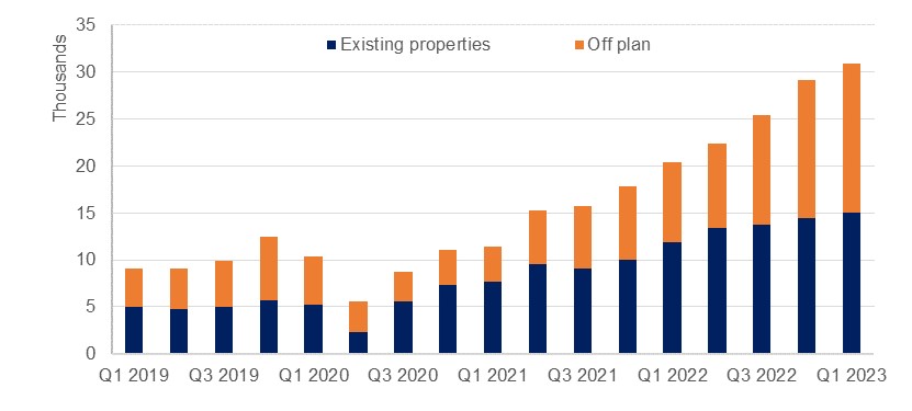 Investors’ appetite for off-plan properties remains strong, with off-plan properties making up 51.5% of total transactions. Buyers may have a preference for off-plan sales in a rising rate environment as developers often provide incentives and flexible payment options.