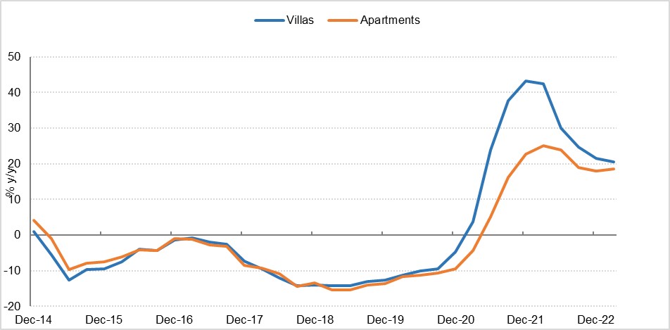 For existing properties, data from ASTECO show that freehold villa sales prices continued to rise in Q1 2023, although growth moderated slightly to 20.5% y/y. On the other hand, freehold apartment prices appear to have gained momentum at the start of 2023, rising 18.6% y/y.
