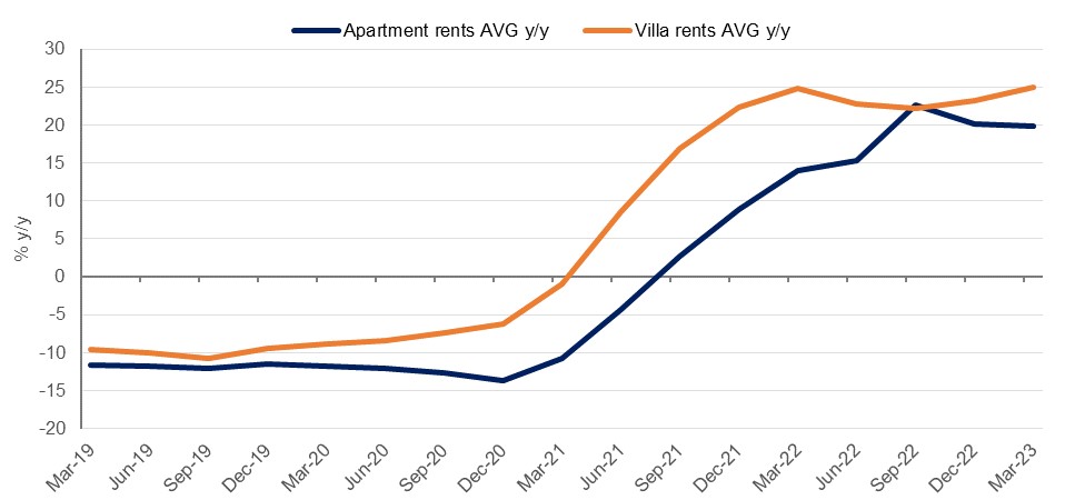 Villa rents rose sharply in Q1, with the average growth in villa rents up 25% y/y.