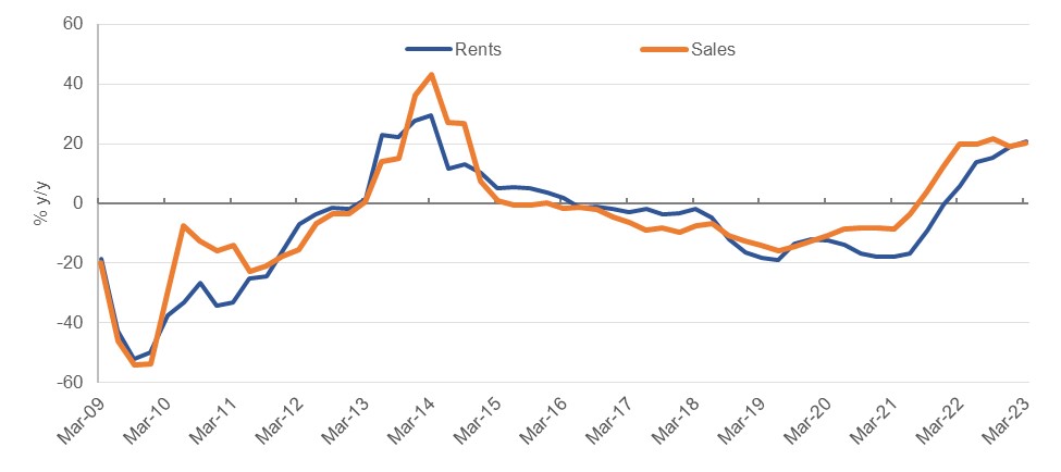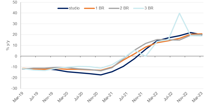 The average growth in rents is starting to stabilize across all apartment segments, with the average growth in apartments rents declining slightly from 20.1% in Q4 2022 to 19.9% y/y in Q1 2023.