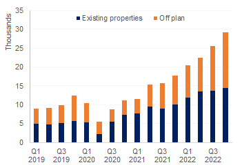 A significant uptick in the purchase of off-plan properties was the main driving force in the second half of the year with the total number reaching 14,764 in Q4 (up 25.6% q/q), surpassing the total number of existing property purchases (14,448, up 5.3% q/q) for the first time since 2019.