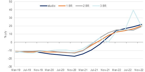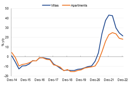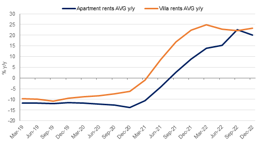 The average growth in rent prices on a y/y basis for apartments dipped in Q4. The price of three-bedroom apartments normalized after spiking in Q3, down from 39.8% to 19.1% in Q4, bringing the aggregate rent growth for all apartments down from 22.6% to 20.1% y/y. Villa rents have continued to rise sharply, up 23.2% y/y in Q4.