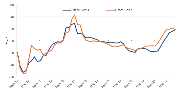 Rent for commercial properties has increased significantly in Q4 of 2022, up 18.8% y/y and 6.8% q/q, the highest annual growth rate for over five years. The average sales price of freehold office space is at its highest point since 2018, despite slowing on both a y/y and q/q basis (from 21.6% to 19.0% and 6.6% to 3.5% respectively).