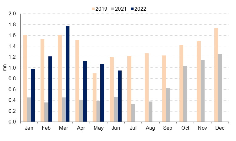 Dubai’s tourism and hospitality sector continued its recovery in June, with more than double the number of international visitors to the emirate than in June 2021. In the first half of this year, 7.12mn people visited Dubai (staying at least one night), up 183% y/y but still around 15% below H1 2019 levels.