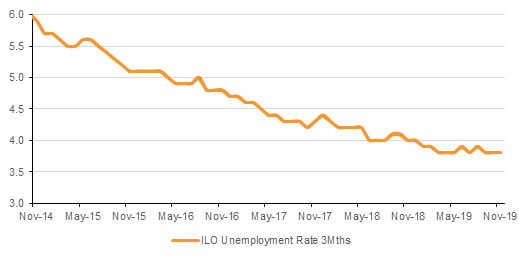 British job growth was the strongest in nearly a year in the three months to November, Tuesday's reading showed the number of people in employment rose by 208,000 to 32.90 million, the biggest increase since the three months to January 2019. The 3m unemployment rate was steady on the previous reading at 3.8%. This was also in line with expectations. Average weekly earnings 3m y/y (ex bonus) modestly exceeded expectations, coming in at 3.2% (flat on the previous reading), compared to consensus of 3.1%. The release of the employment data had taken on an especial significance this month as it comes shortly before the Bank of England’s January 30 decision. Particularly weak December retail data, coupled with a series of lacklustre earnings results from consumer-focused firms and a more dovish address by Governor Mark Carney in January have all served to raise expectations that the Bank of England would cut its bank rate from 0.75%. In light of the data release, we would maintain our expectation of a hold next week.