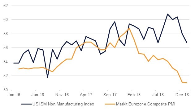 There was a spate of PMI data releases yesterday from developed market economies. While the final PMIs from the Eurozone were revised higher from the flash estimates, they were still lower compared to the previous month. In fact, Eurozone’s composite PMI reading of 51.0 was the lowest since July 2013. Within Eurozone, there were contrasting pictures with Italy’s reading coming in at 48.8 while that in Spain was a touch stronger at 54.5. In the UK, it appears that lack of progress on Brexit has started to affect businesses. The Markit/CIPS service survey slowed down to 50.1 in January 2019 from 51.2 in December 2018. The employment component dropped from 50.6 to 49.3, the lowest level since 2012, clearly suggesting that concerns over Brexit is creeping into hiring decisions.