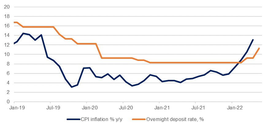 The Central Bank of Egypt hiked its benchmark interest rates by 200bps yesterday, taking the overnight deposit rate to 11.25%. This was a bigger move than the consensus expectation (100 bps), but smaller than our prediction (300bps) as we had anticipated more rapid tightening from the CBE following the 13.1% y/y inflation print for April . With the CBE taking a less aggressive stance than we had anticipated we have pared our expectation for June’s meeting to a hike of 150bps, from 200bps previously. Nevertheless, the direction of travel will remain towards tighter monetary policy with inflation set to remain high over the next several months and the US Federal Reserve signposting a series of 50bps hikes itself.