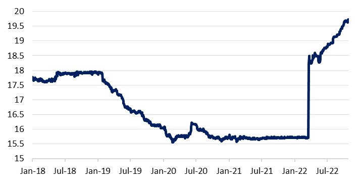 In common with many emerging markets, Egypt’s external position has come under increasing pressure this year as the commodity price spike following Russia’s invasion of Ukraine led to a surge in import costs, while risk-off sentiment and tightening global monetary policy saw large portfolio outflows. Egypt went to the IMF in March, but a deal has not been forthcoming to now, and while the EGP has continued to depreciate steadily since the bigger move in March, it has arguably not kept pace with moves lower by other comparable emerging markets, especially when the static interest rates of the past several months are taken into account. EGP is trading at an all-time low of 19.7239 against the dollar at the time of writing, having lost around 20% ytd.