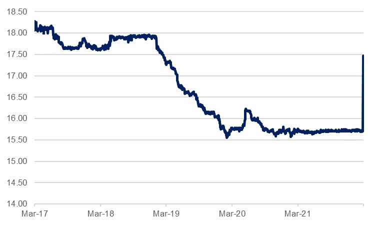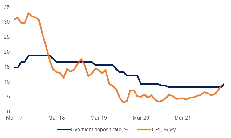 The Central Bank of Egypt implemented an early rate hike to its benchmark interest rates on Monday, pre-empting its scheduled March 24 meeting by three days. The MPC raised rates by 100bps, taking the overnight deposit rate to 9.25%, while the overnight lending rate moved up to 10.25%. The bank’s communique cited the persistent global price pressures related to the reopening frictions from the Covid-19 pandemic and the higher commodity prices driven by the Russian invasion of Ukraine.