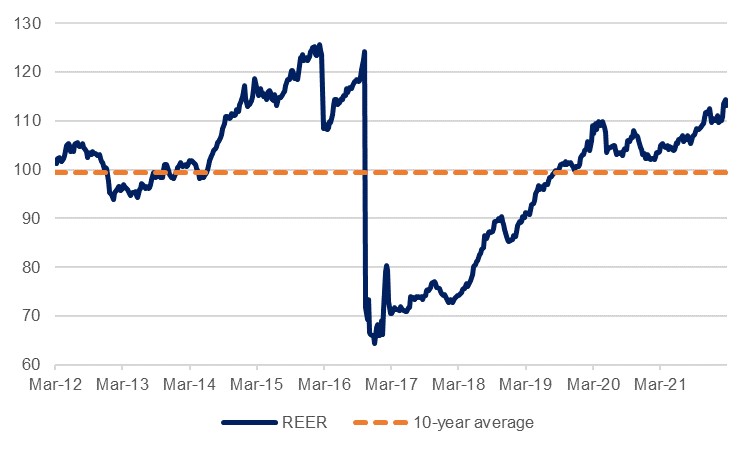 Meanwhile, the Egyptian pound depreciated by 11.2% to EGP 17.48/USD in the wake of the surprise announcement, as the MPC statement stressed ‘the importance of the exchange rate flexibility to act as a shock absorber to preserve Egypt’s competitiveness.’ This depreciation, which followed some 18 months of stable exchange rates around EGP 15.70/USD, will take the currency back closer in line with its long-run REER average, having appeared overvalued on this measure in the run-up to the move.