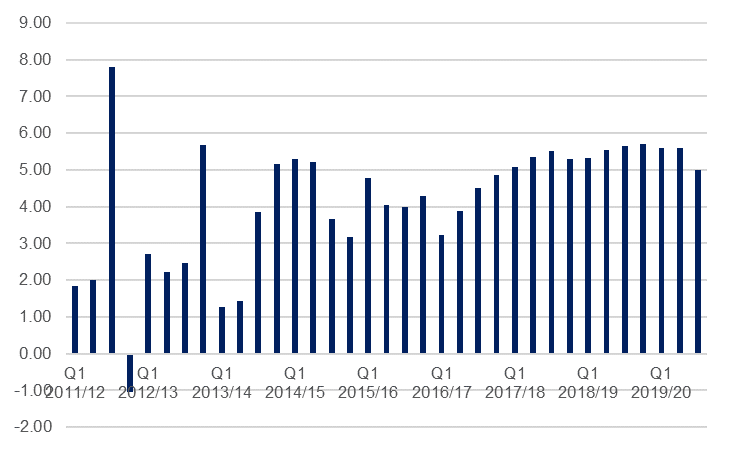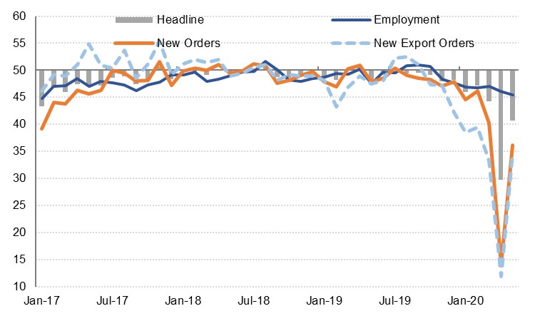 While Egypt’s real GDP growth came in below government expectations of 5.9% in Q3 2019/20 (quarter ended March 31), the 5.0% expansion was nevertheless fairly robust in light of the global coronavirus pandemic, reflecting the relatively late escalation of the crisis in Egypt. Measures to contain the virus did not start in earnest until well into the third month of that quarter, meaning that the real impact will be felt far more starkly in the present reporting period. This current quarter (Q4 of fiscal 2019/20, ending June 30) will likely be a far more sobering reading, and this has already been presaged by the sharp fall in Egypt’s PMI survey, which fell from 44.2 in March to 29.7 in April, the lowest reading in the present series going back to 2011. The May reading, at 40.7, still denotes a fairly sharp contraction in the non-oil sector as compared to the previous month, and is far weaker than the average 49.1 recorded through calendar 2019.