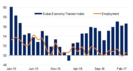 The Emirates NBD Dubai Economy Tracker Index (DETI) rose to 56.6 in March from 56.2 in February, on the back of stronger output and new work growth. Inventories also increased at a faster rate last month. The DETI for Q1 2017 averaged 56.7, indicating the fastest rate of growth in Dubai’s non-oil private sector since Q1 2015. Employment grew marginally in March, with this index rising to 50.7 in March from 49.9 in February. Overall, employment growth has been slow in Q1 2017, with this index averaging just 50.6, compared with 53.4 in Q1 2015.
