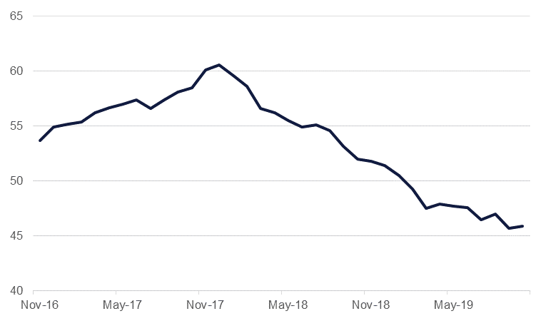 The Manufacturing PMI Index for the Eurozone continues to feel the negative impact of the US-China trade war on global trade and lack of clarity over Brexit. IHS Markit’s final manufacturing PMI stood at 45.9 in October, barely moving above the previous month’s 45.7, and remaining firmly in contraction territory below the 50 mark for the 9th month running. The index as a whole remains around seven year lows. Germany, Europe’s largest economy is seeing its manufacturing sector remain contraction mode, at 42.1 from 41.7 in September marking the 13th month of contraction for the sector as a whole, and factories in Germany are shedding jobs at the fastest pace in 10 years. Even stronger performers like France, Greece and the Netherlands barely saw their manufacturing sector brake away from the 50 PMI mark.