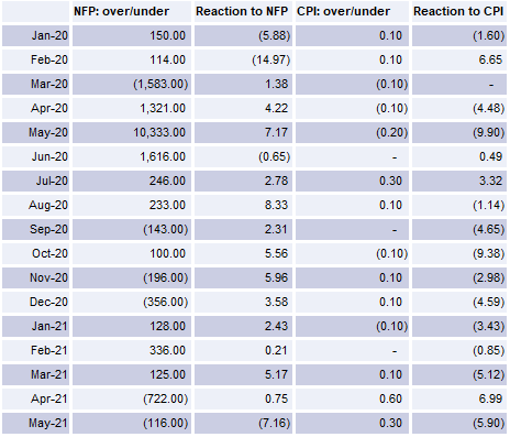 Source: Bloomberg, Emirates NBD Research. Note: Over/under is actual versus median estimate; reaction is 1 day change in 10yr UST yield in bps.