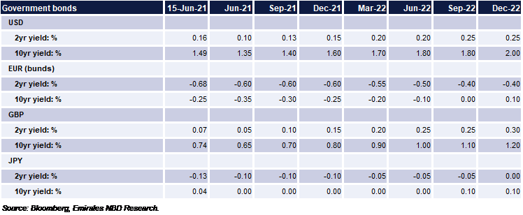 We are holding our view for a moderate rise in 10yr yields throughout the rest of the year in line with a general recovery in the economy—buffered and buffeted by improving labour and high inflation. We would highlight upside risks to our views as the Fed starts to communicate how it will bring an end to asset purchases, potentially as early as this week’s FOMC but more likely in more in depth discussion at the Jackson Hole symposium toward the end of the summer.