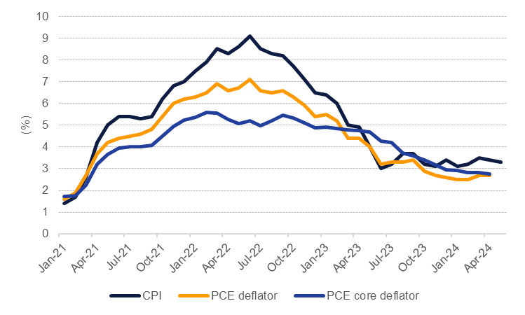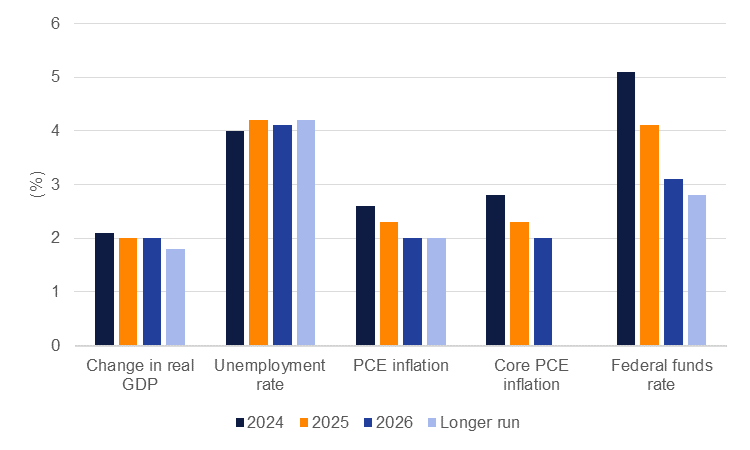 The overall message from the Fed was to maintain a hawkish eye over the economy while noting the progress that is being made on inflation. While the median forecast is for rates to be 25bps lower by the end of the year, the possibility of 50bps worth of cuts still remains live, particularly if inflation data follows a similar path to the April-May prints. For now we are holding our expectation for the Fed to cut rates by 25bps twice in the second half of 2024.