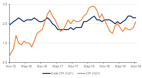 U.S. November CPI rose 0.3% m/m, with the core up 0.2% m/m, with the headline a little firmer than expected, due largely to an 0.8% rise in energy . The yearly rate rose to a 2.1% y/y on the headline, versus November's 1.8%, while the core rate was steady at 2.3% y/y.