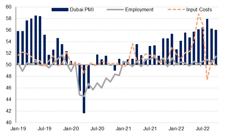 The tourism sector PMI for October improved on the previous month as the headline reading rose to 56.0, up from the eight-month low of 55.3 in September. It was the second-strongest among the three industries covered, but will likely see a fillip through November and December as Dubai benefits from the FIFA World Cup happening in Qatar. Employment rose at the fastest pace since November 2019 as new work continued to rise at a faster pace than the previous month, albeit still slower than through the rest of the year. Discounting was at the sharpest rate since January as input prices fell once more.