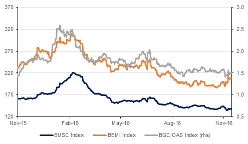 In a slow and holiday shortened week, fixed income markets were largely range bound with policy divergence becoming apparent in sovereign bond yields. Yields on UST continued to rise with 2yr and 10yr treasury yields closing at 1.12% (+5bps on the week) and 2.36% (+4bps) respectively while those on 10yr Gilts and Bunds narrowed down to 1.41% (-1bp) and 0.24% (-3bp) respectively. Though expectations of any positive outcome from the upcoming OPEC meeting this week are not well anchored, credit spreads remained well supported and high yield bonds across the globe did particularly well.